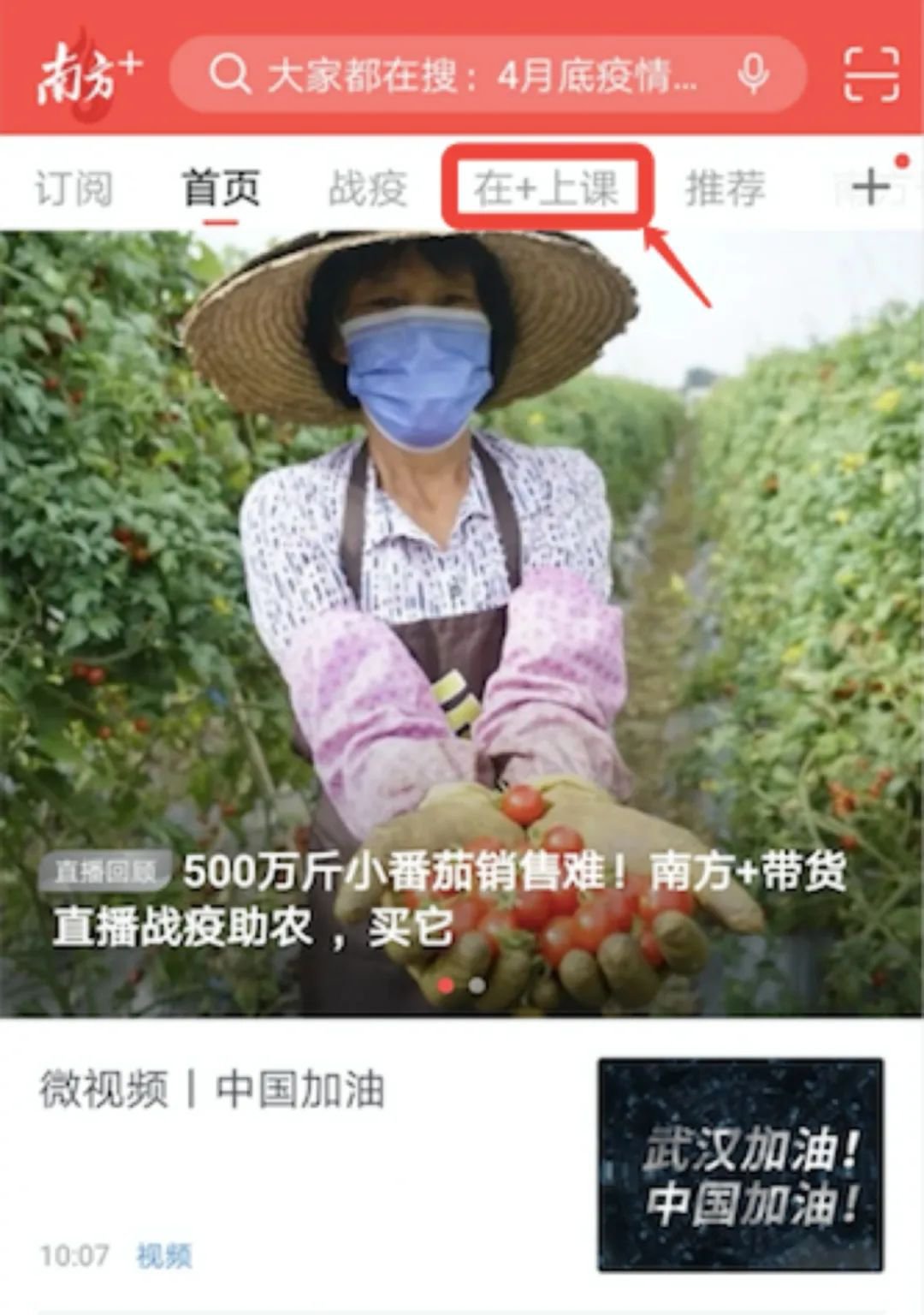 第一步:打开南方+客户端,点击上方搜索栏下的“在+上课”频道。