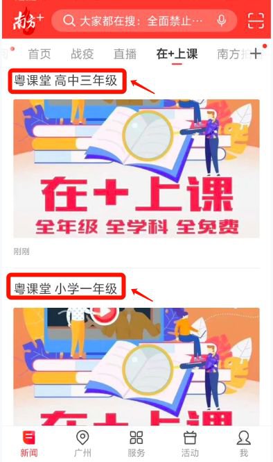 第二步:打开“在+上课”频道,进入页面,并点击想要观看“粤课堂”年级课程,如“粤课堂高中三年级”“粤课堂小学一年级”等。
