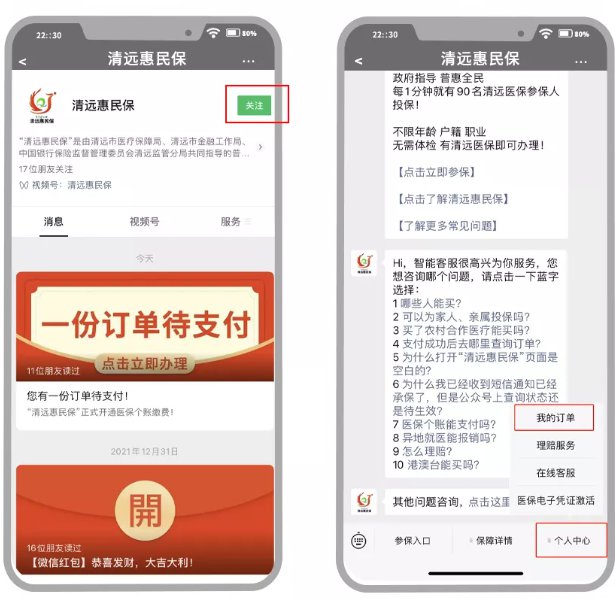 1.微信搜索清远惠民保,进入公众号界面点击我的订单