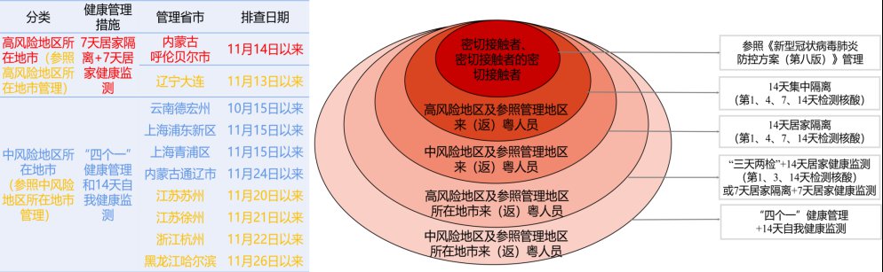 | 4.对有中风险地区所在地市及参照管理地市(除高中风险地区外)旅居史来(返)粤人员:“四个一”健康管理和14天自我健康监测;参照中风险地区所在地市管理(2个):上海市杨浦区、河北省石家庄市。 | |||||