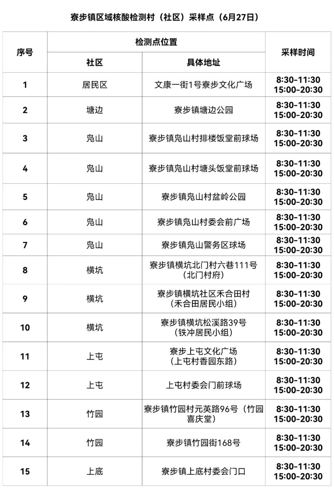6月27日寮步镇核酸检测重点抽检安排如下: