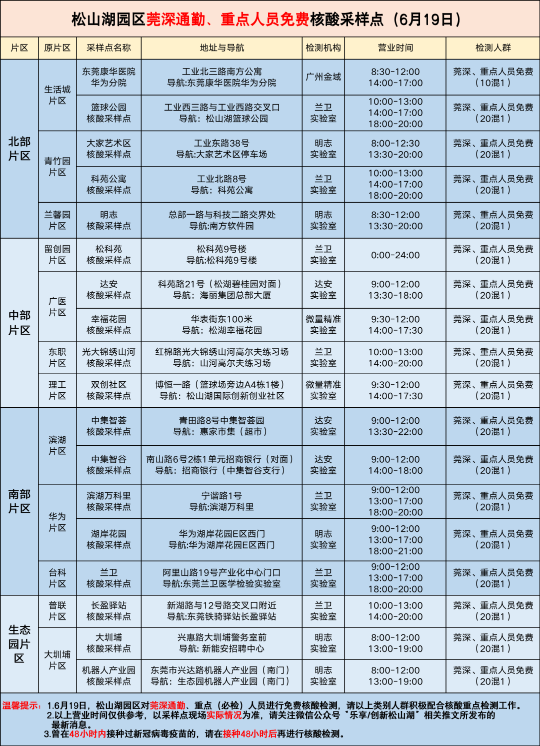 为做好我市疫情防控工作,根据疫情防控需要和市指挥办统一部署,园区加大核酸检测力度。6月19日,松山湖园区对莞深通勤人员、深圳通勤较多的小区、重点行业、重点企业等人员开展核酸重点检测工作,严格按照要求落实核酸检测,不漏一人,不漏一户。现将有关安排通告如下: