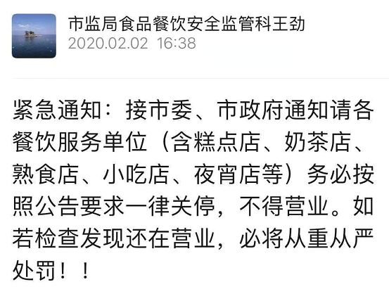 汕头不少市民朋友微信群和朋友圈流传一张截图:截图上显示一名来自“市监局食品餐饮安全监管科王劲”的工作人员,发布了一则“紧急通知”。通知中提到,接市委、市政府通知,各餐饮服务单位务必按照公告要求一律关停,不得营业。如若检查发现还在营业,必将从重从严处罚。一时间,令不少餐饮行业从业人员人心惶惶。
