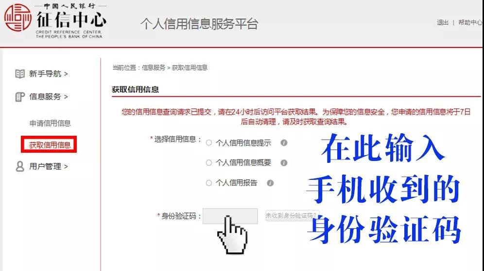 4.在信息服务-获取信用信息-身份验证码中输入手机收到的身份验证码