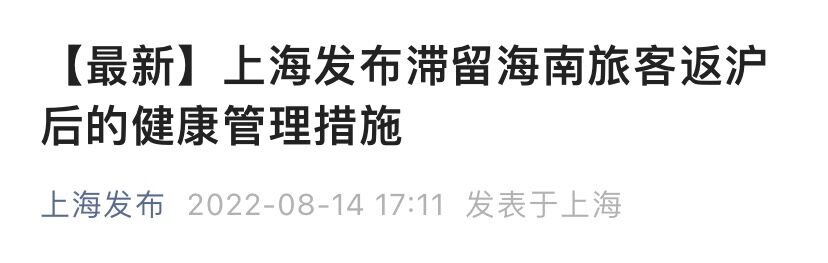 2022年8月14日,上海市新冠肺炎疫情防控工作领导小组办公室发布消息:根据国务院联防联控机制有关要求,为进一步加强我市滞留海南旅客返沪后的健康管理工作,巩固我市疫情防控成果,经研究,对返沪的海南滞留旅客采取如下健康管理措施: