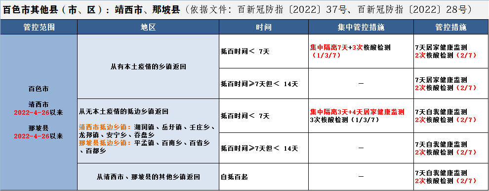 有以下地区旅居史,或与阳性感染者活动轨迹有交集的来(返)百色的市民,请提前 24 小时向目的地社区(村、屯)报备,在抵百后 12 小时内向目的地社区(村、屯)报告,纳入社区管理,并配合做好医学隔离观察或健康监测等健康管理工作。