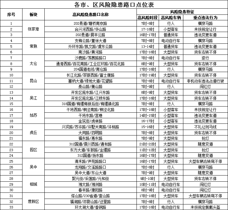 苏州交警部门通过对历史交通事故数据开展分析研判,梳理了33条交通事故风险隐患路口(见附表),请广大驾驶人朋友途经下列交通事故风险隐患路口前,提前刹车减速、控制车距、注意观察、谨慎通行;请电动自行车驾乘人员和行人要严格遵守交通法律法规,切莫拿自身安全开玩笑。