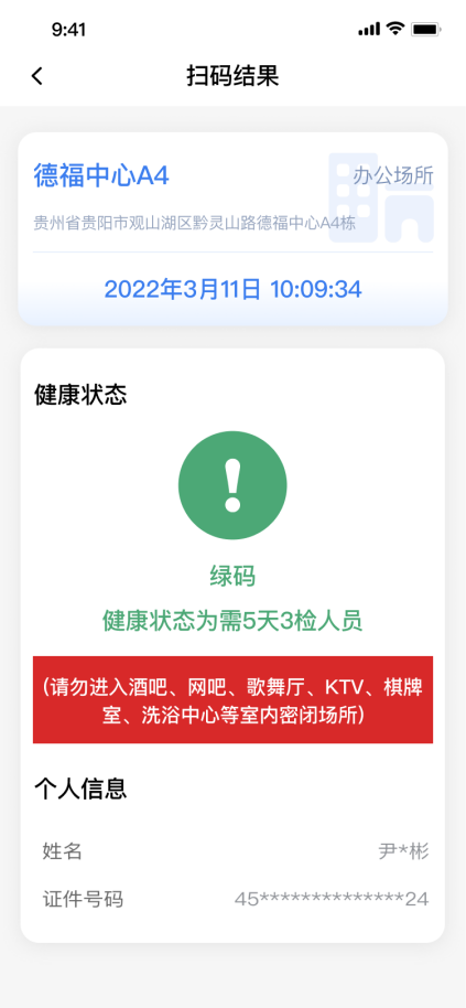 “需5天3检”标识消失前,请您外出时一定要戴好口罩,尤其是不要去酒吧、网吧、影剧院、歌舞厅、KTV、棋牌室、洗浴中心等室内密闭娱乐场所,否则您在扫场所码时会发出红色警示。