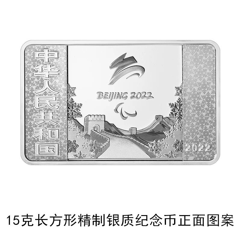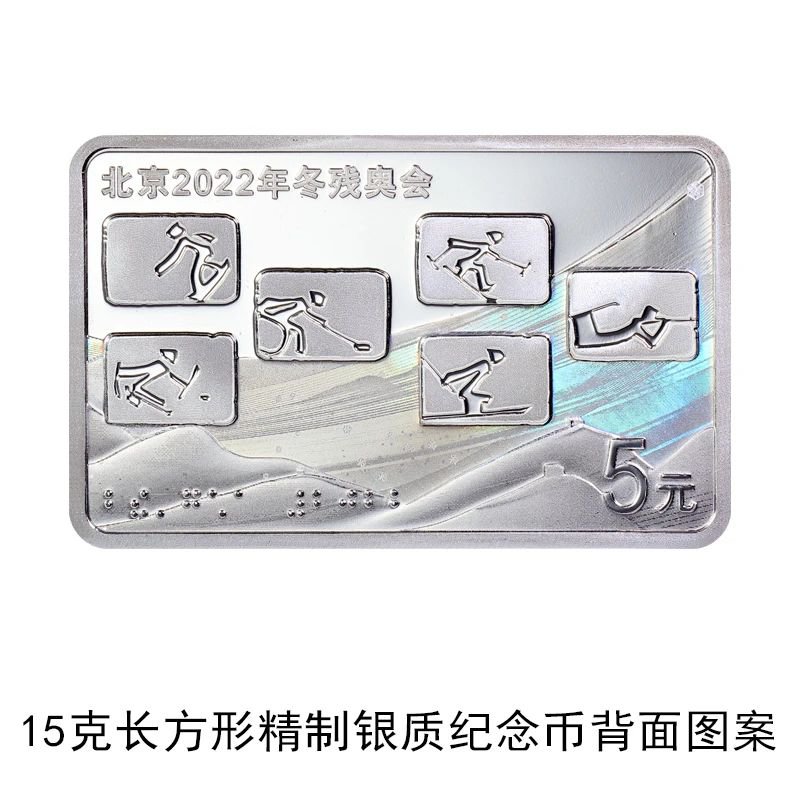 15克长方形银质纪念币背面图案为冬残奥会6个运动项目体育图标,辅以核心图形、雪花、“北京2022”盲文等元素组合设计,并刊“北京2022年冬残奥会”字样及面额。