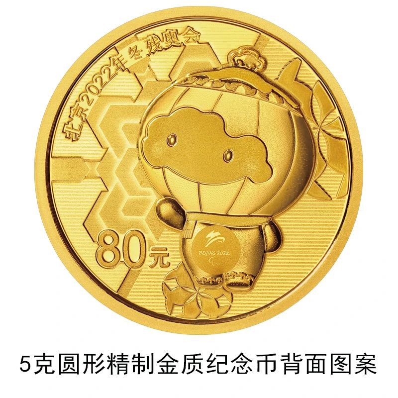 5克圆形金质纪念币背面图案为冬残奥会吉祥物,辅以雪花元素组合设计,并刊“北京2022年冬残奥会”字样及面额。