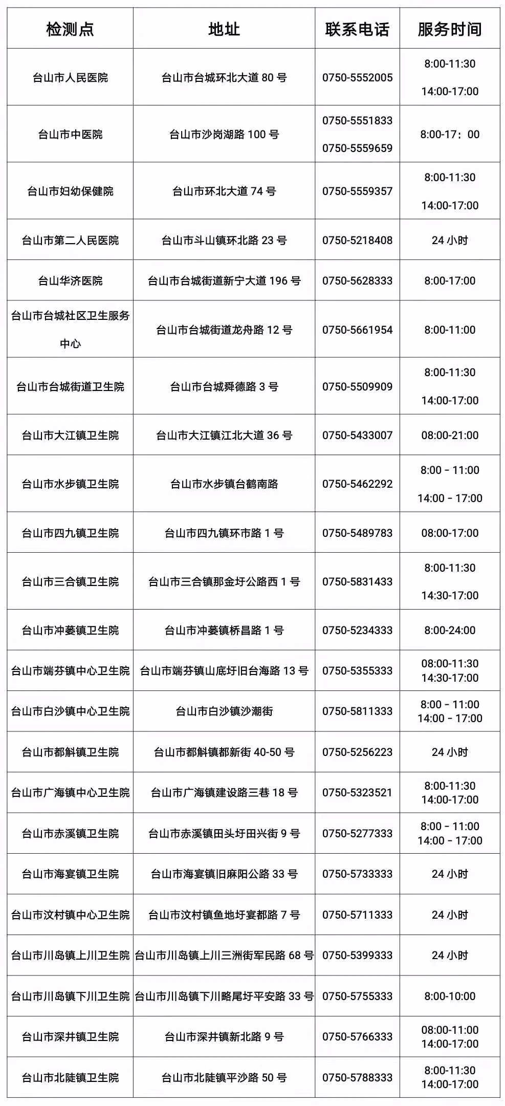 台山市核酸采样机构信息表
