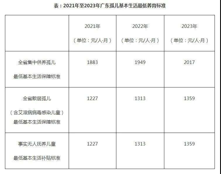 经广东省政府同意,省民政厅、省财政厅联合印发《关于提高我省2021年至2023年孤儿基本生活最低养育标准的通知》(以下简称《通知》),明确2021年至2023年孤儿(含艾滋病病毒感染儿童、事实无人抚养儿童)基本生活最低养育标准。
