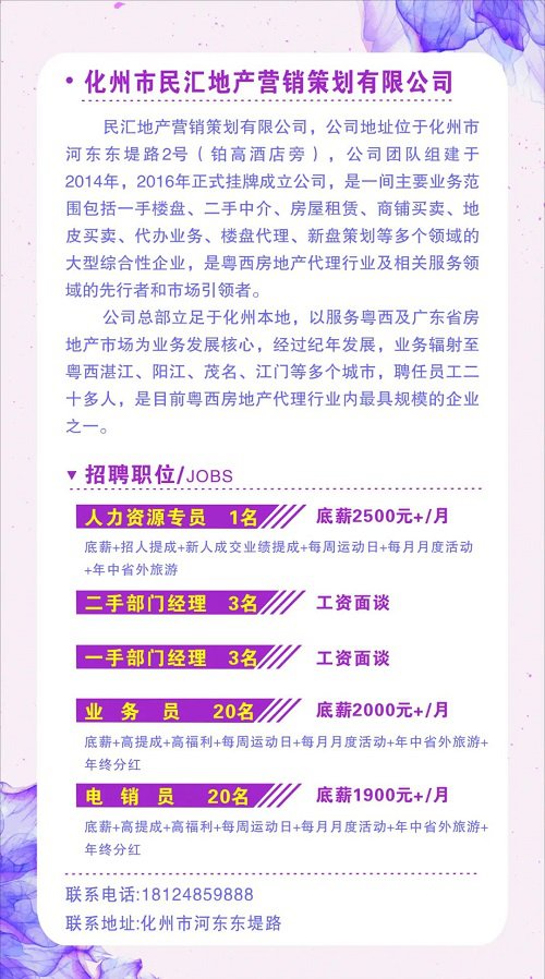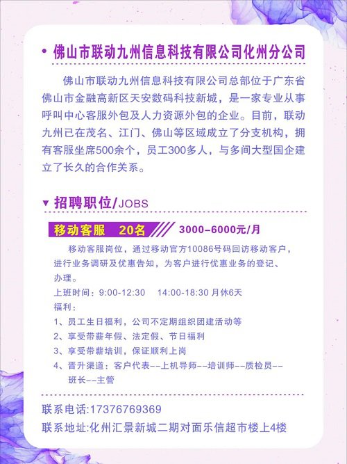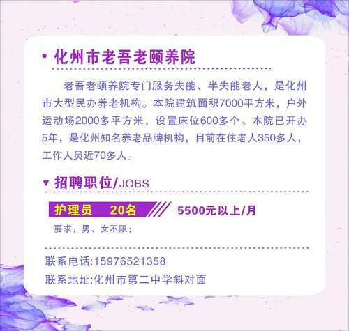 根据各级党委、政府应对新型冠状病毒疫情防控的工作要求,为有效防止疫情扩散蔓延,在严控人员聚集的情况下,开展化州市“南粤春暖”网络招聘(女性专场),搭建劳务供需沟通平台,通过利用网络资源,发布企业用工需求信息,帮助企业和个人解决招聘及求职问题。