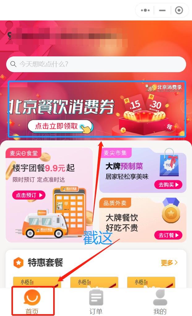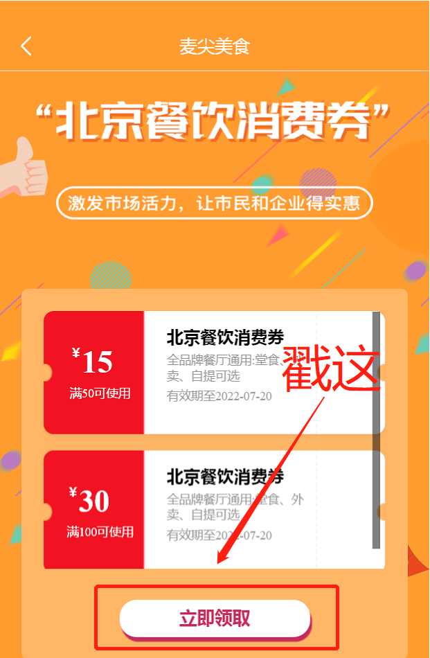 麦尖美食微信小程序有两种领取方式,一种可以在首页【弹窗】领取消费券,也可以在首页的“北京餐饮消费券”活动页领取。