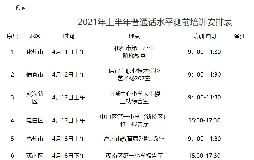 地点:分别在信宜市、化州市、滨海新区、电白区、高州市、茂南区等地区设培训地点。