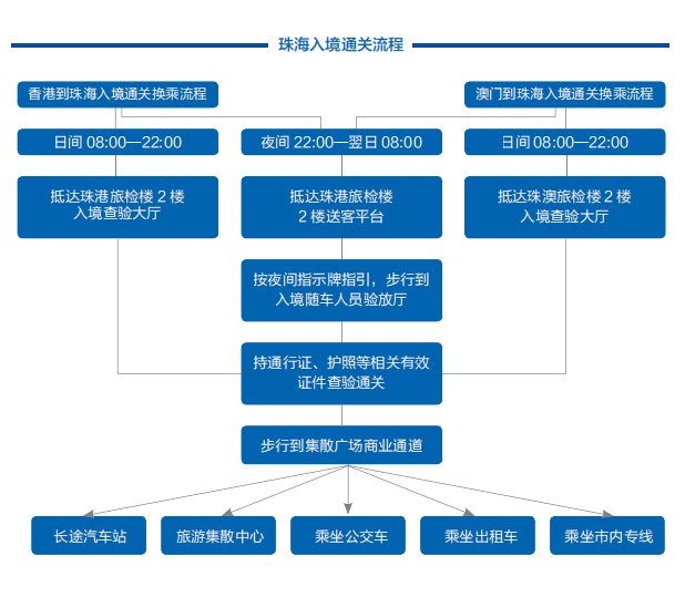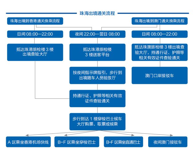 从澳门入境的旅客,在珠澳旅检楼2楼入境层查验过关后,可选择多种交通工具前往珠海和广东省内其他主要城市。