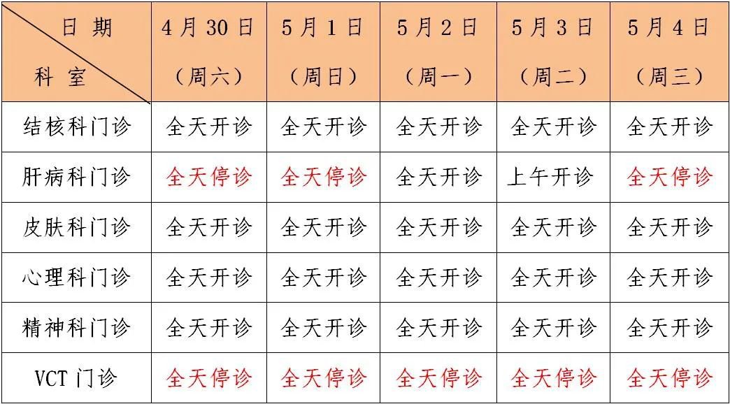 结合实际情况,阳江市公共卫生医院“五一”假期门诊出诊安排如下(具体出诊医生请咨询我院门诊挂号处或阳江市公共卫生医院微信公众号查询):