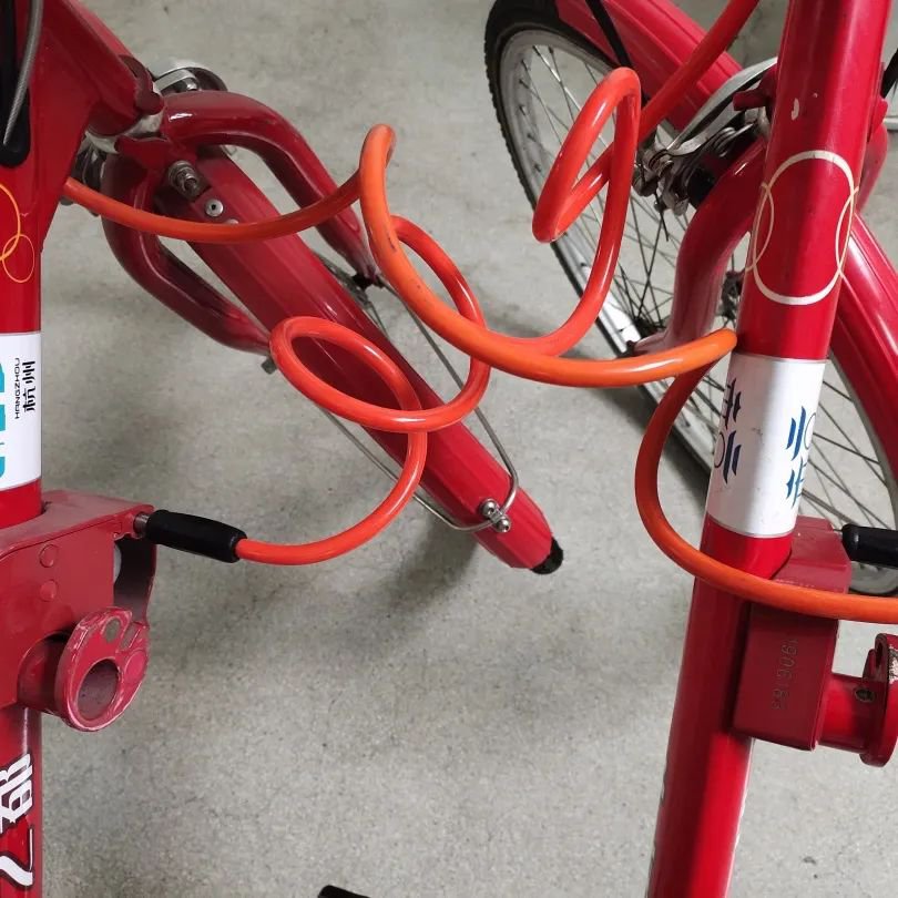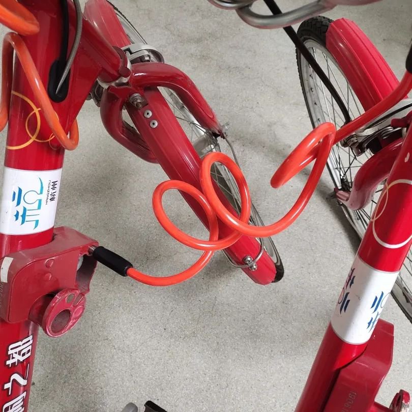如果是两个人一起出行,可以将两辆小红车锁在一起,就是将一辆小红车的锁辫插到另一辆小红车的锁口,交叉上锁,然后拔走钥匙。连在一起的两辆小红车,也能保持固定。