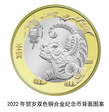背面主景图案为中国传统剪纸艺术与装饰年画元素相结合的老虎形象,衬景图案为花灯和松枝、松果,币面左侧刊“壬寅”字样。