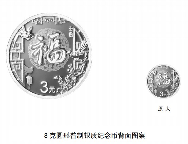8克圆形银质纪念币背面图案为明代文征明的“福”字造型,配以窗格、剪纸团花、喜鹊、梅花、民居房檐等造型组合设计,并刊“壬寅”字样及面额。