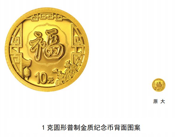 1克圆形金质纪念币背面图案为明代文征明的“福”字造型,配以窗格、梅花、民居房檐等造型组合设计,并刊面额。