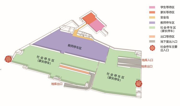 同时经过仔细研究,将地下停车库和校园的安全管理放在重要位置,家长接送通道在非上学和放学时段,处于封闭状态,将校园和社会停车进行有机的物理分隔,保证校园的安全管理需求。