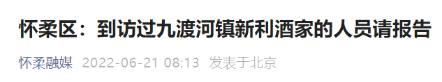 请6月19日以来到访过怀柔区九渡河镇新利酒家(怀柔区九渡河镇九渡河村西加油站对面)的人员,迅速向所在社区(村)居委会、单位及宾馆(酒店)报告,立即就地居家隔离或居店隔离,配合做好相应管控措施。如有发热、咳嗽等相关症状,要立即报告,并按相应管控要求及时就医。