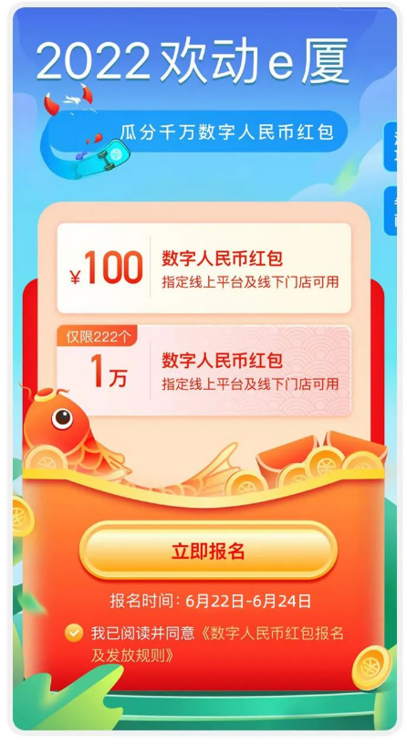 活动说明:厦门将发放2022万元数字人民币消费红包,中签最高可得10000元!请按以下方式报名并特别注意以下四点: