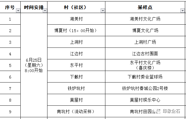 企石镇新冠病毒核酸抽检采样点安排表(6月25日)