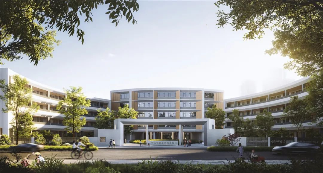 项目位于芙蓉塘南、鑫安南路东。总用地面积为57446.63平方米,约86亩,总建筑面积约4.9万平方米。新建5栋教学楼,1栋行政楼,1栋学生食堂,1栋风雨操场,架空车库和非机动车库等,体育设施包含三百米跑道、室内外篮球场、综合器械区以及室内辅助功能。通过智慧之环的设计理念,串联起校园各处公共空间,打造一个仪式感十足,鼓励交流与互动的花园式小学。