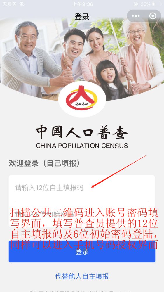 打开微信“扫一扫”,扫描普查员所提供的住户唯一二维码或者扫描公共二维码(正式普查时公布)用账号密码进入第七次全国人口普查小程序。
