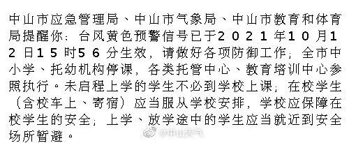 中山市应急管理局、中山市气象局、中山市教育和体育局提醒你:台风黄色预警信号已于2021年10月12日15时56分生效,请做好各项防御工作;全市中小学、托幼机构停课,各类托管中心、教育培训中心参照执行。