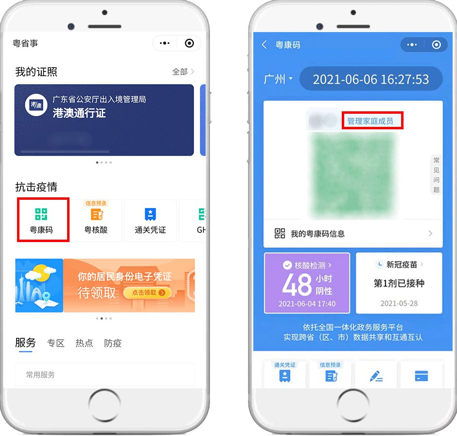 粤康码家庭成员管理功能,可添加家庭成员,代家人出示二维码。例如没有手机的老人小孩出行时,可由家人代为亮码。