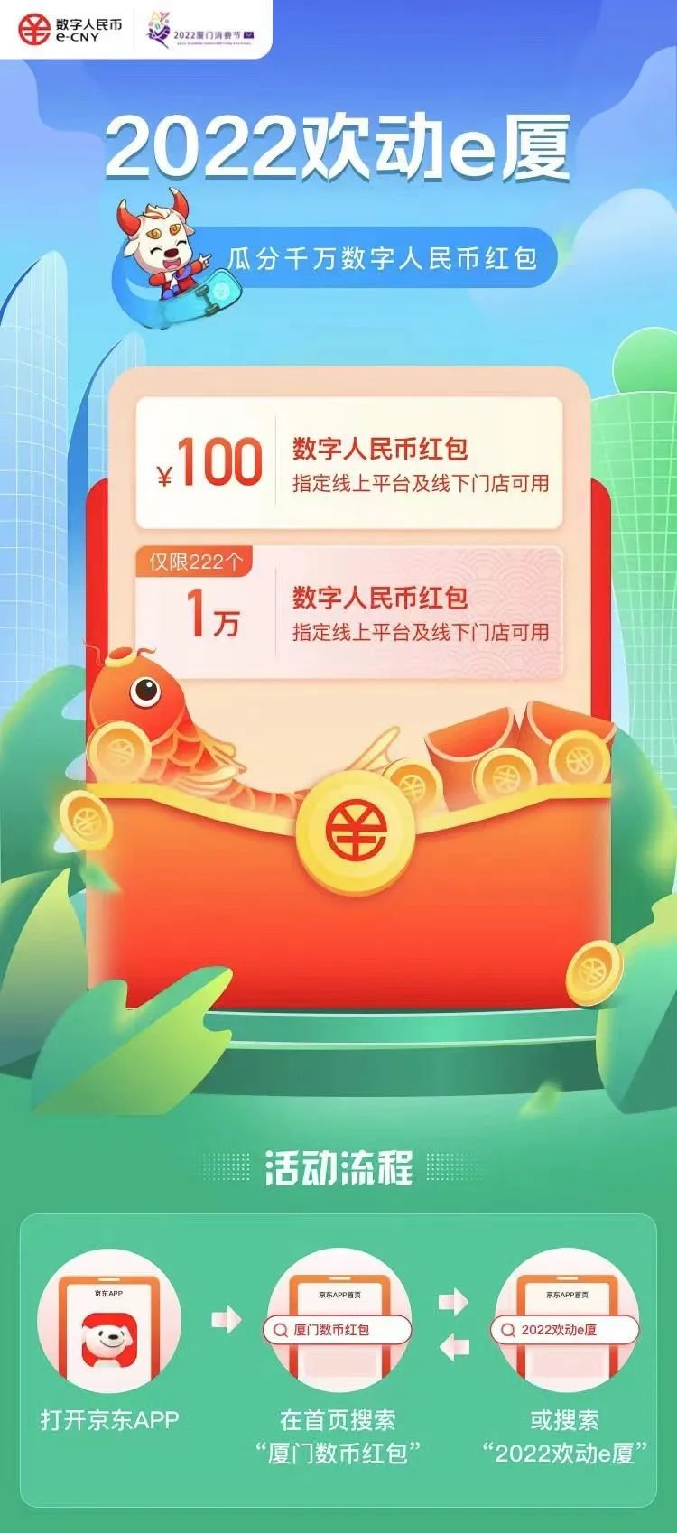 6月22日9:00-6月24日24:00前报名,在厦投放数字人民币红包金额达2022万元,包含18万个金额为100元的数字人民币红包,222个金额为10000元的数字人民币“锦鲤红包”。