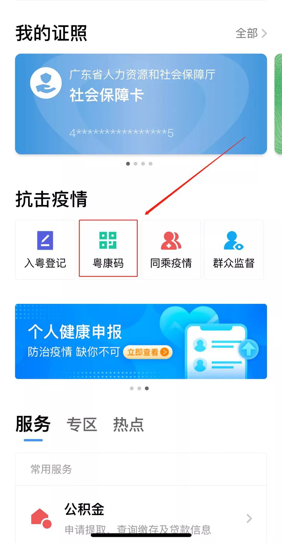进入粤省事小程序,首页“我的证照”-“抗击疫情”-“粤康码”,如实填写相关信息即可获取。