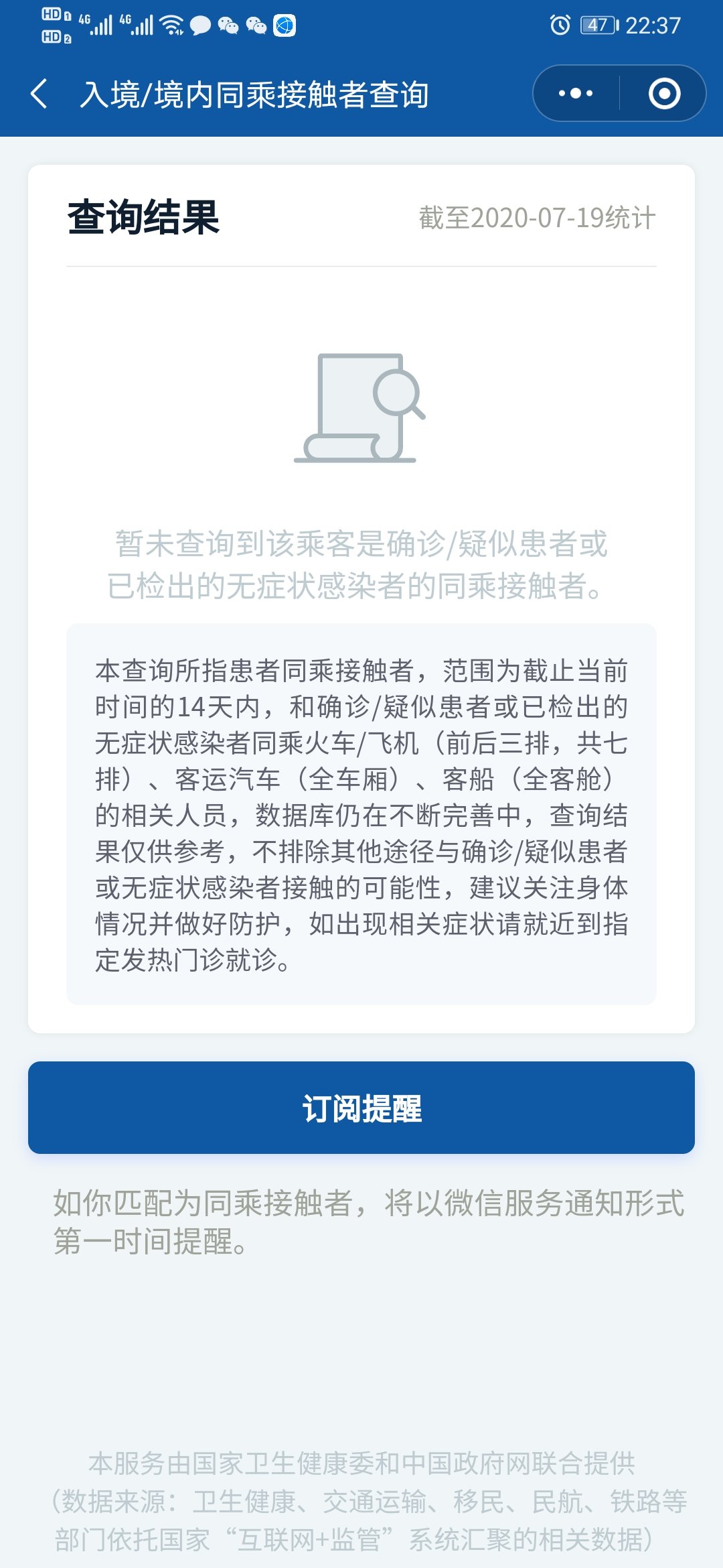 第四步:完成后,即可获得自己的同程查询结果(注意了,结果仅供参考,查询人还是需要多留意自己的身体情况,如出现不适建议前往医院就诊)