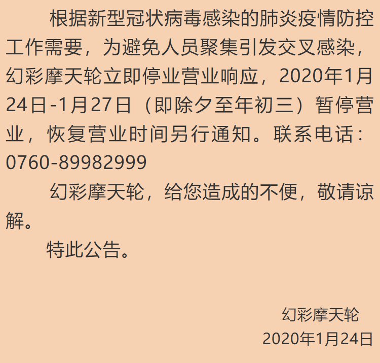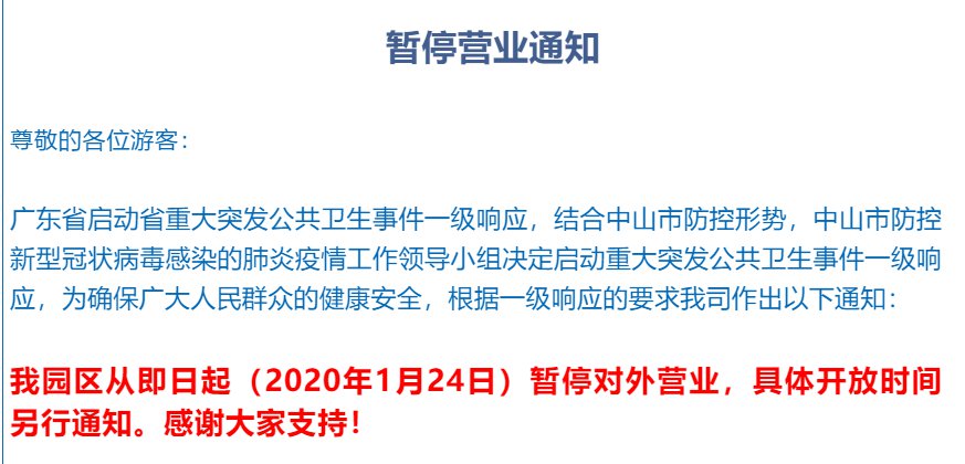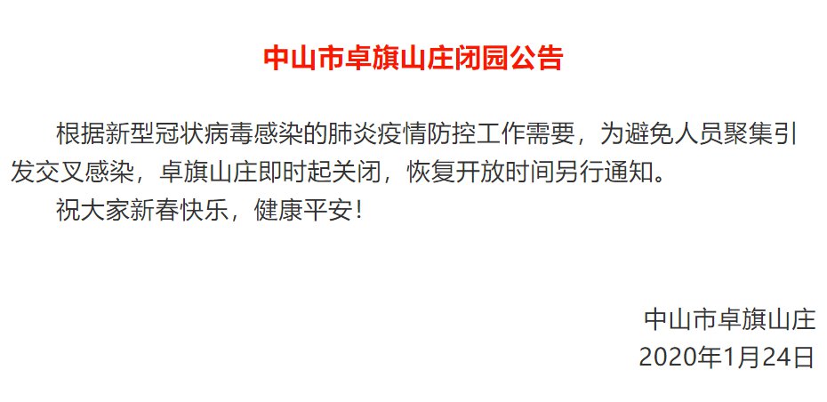 根据新型冠状病毒感染的肺炎疫情防控工作需要,为避免人员聚集引发交叉感染,孙中山故里旅游区即时起关闭,恢复开放时间另行通知。