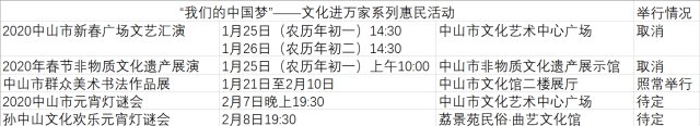 2020中山市新春广场文艺汇演原定于1月25日、26日下午14时30分于中山市文化艺术中心广场举行,2020年春节非物质文化遗产展演原定于1月25日上午10时于中山市非物质文化遗产展示馆(孙中山故居纪念馆内)举行。
