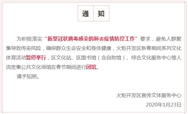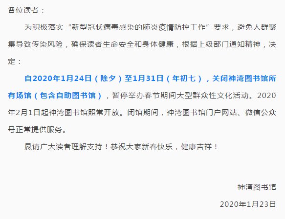 自2020年1月24日(除夕)至1月31日(年初七),关闭中山纪念图书馆所有场馆,包含中山书房(即街区自助图书馆),暂停举办春节期间大型群众性文化活动。