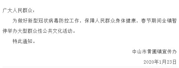 市文化馆表示,受新型肺炎疫情影响,中山确定将取消2020中山市新春广场文艺汇演及2020年春节非物质文化遗产展演。