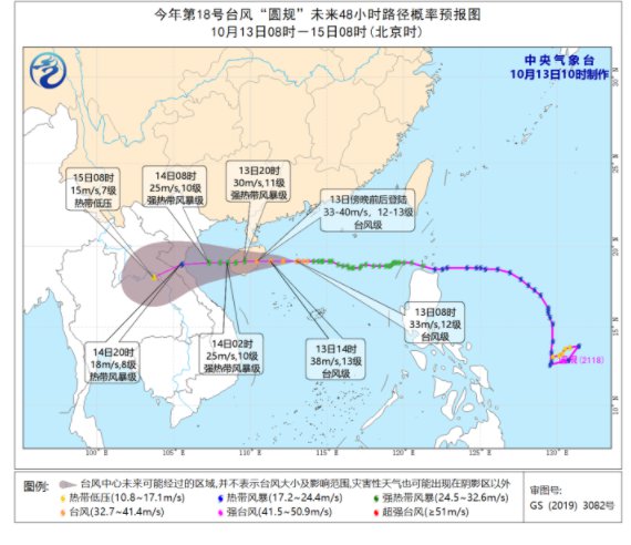 今年第18号台风“圆规”的中心今天(13日)上午10点钟位于海南省万宁市以东大约205公里的南海西北部海面上,就是北纬19.1度、东经112.3度,中心附近最大风力有12级(33米/秒),中心最低气压为970百帕,七级风圈半径为260-420公里,十级风圈半径为100-150公里。