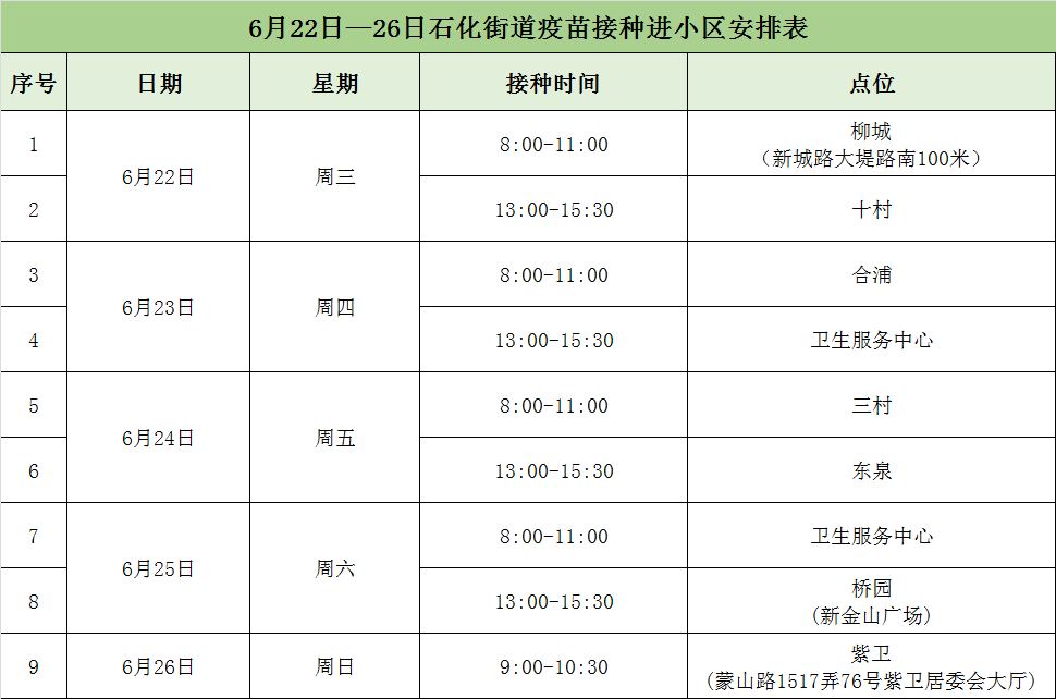为不断筑牢人群免疫屏障,方便市民朋友就近及时接种新冠病毒疫苗,现将6月22日-26日期间石化街道新冠疫苗接种安排告知如下: