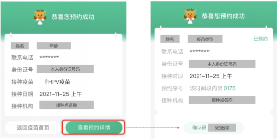 预约成功后,点击“查看预约详情”,将获得确认码,收到预约短信,之后请携带相关证件,按预约时间准时前往接种点接种。
