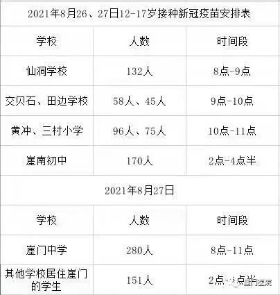 崖门医院8月26日、8月27日开展12-17岁人群新冠疫苗接种专场,第1针和第2针(与第一剂间隔21天以上)可接种。