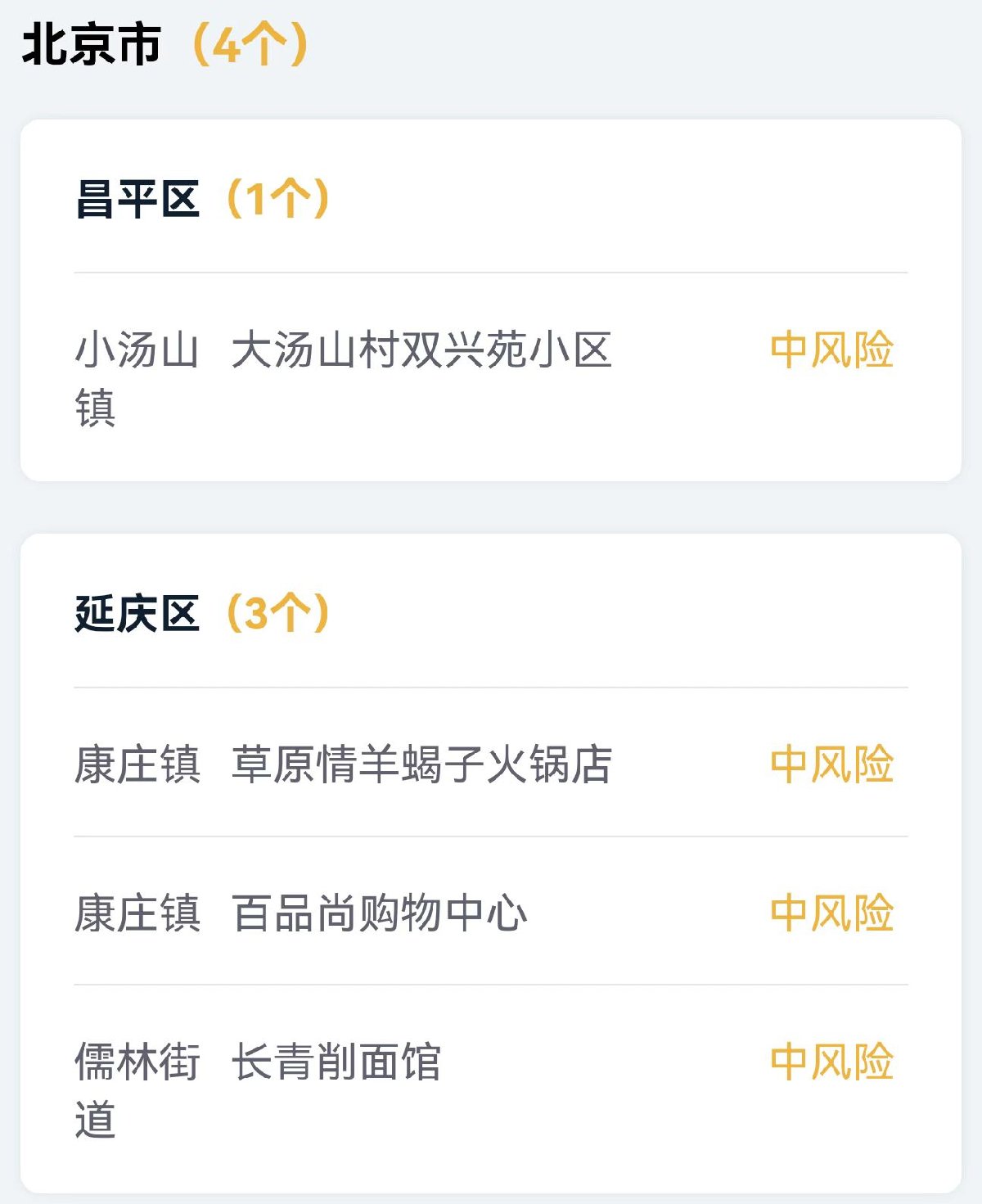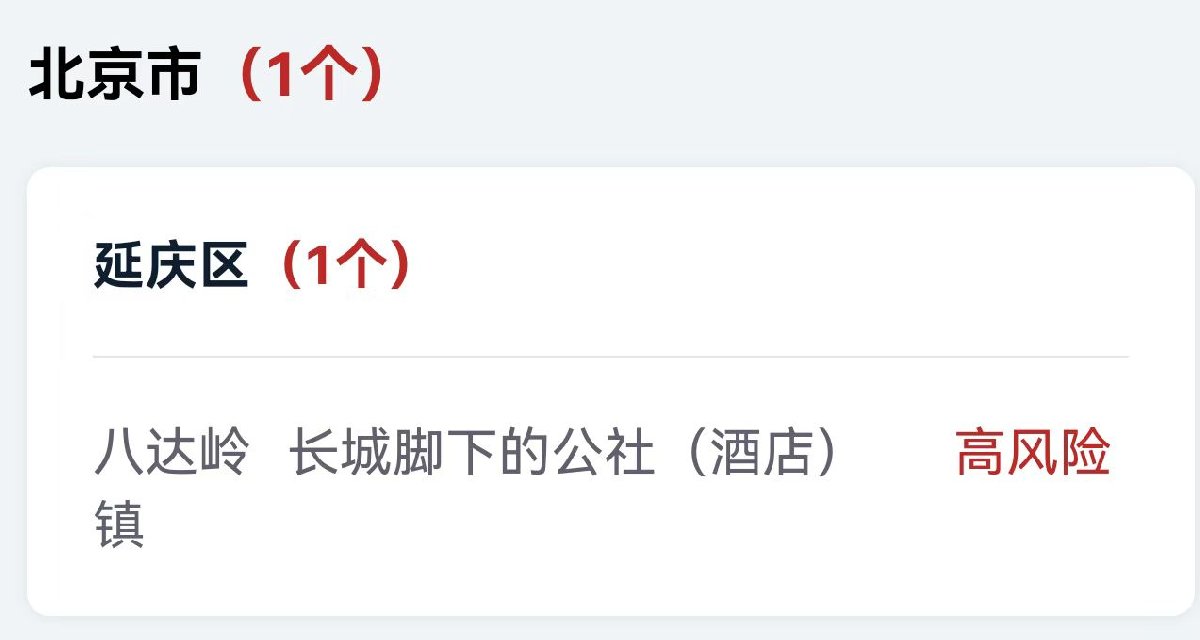 截至目前,北京共有高风险地区1个,中风险地区4个。