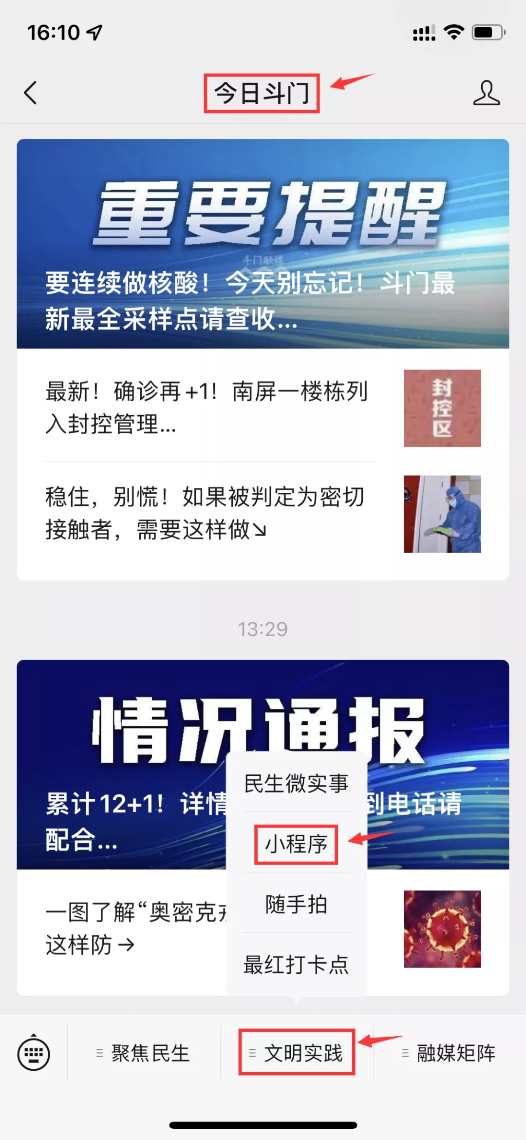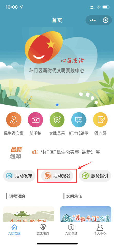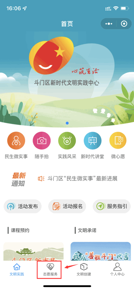 步骤②:进入公众号点击菜单栏【文明实践】,点击【小程序】登入“斗门区新时代文明实践中心”小程序▽