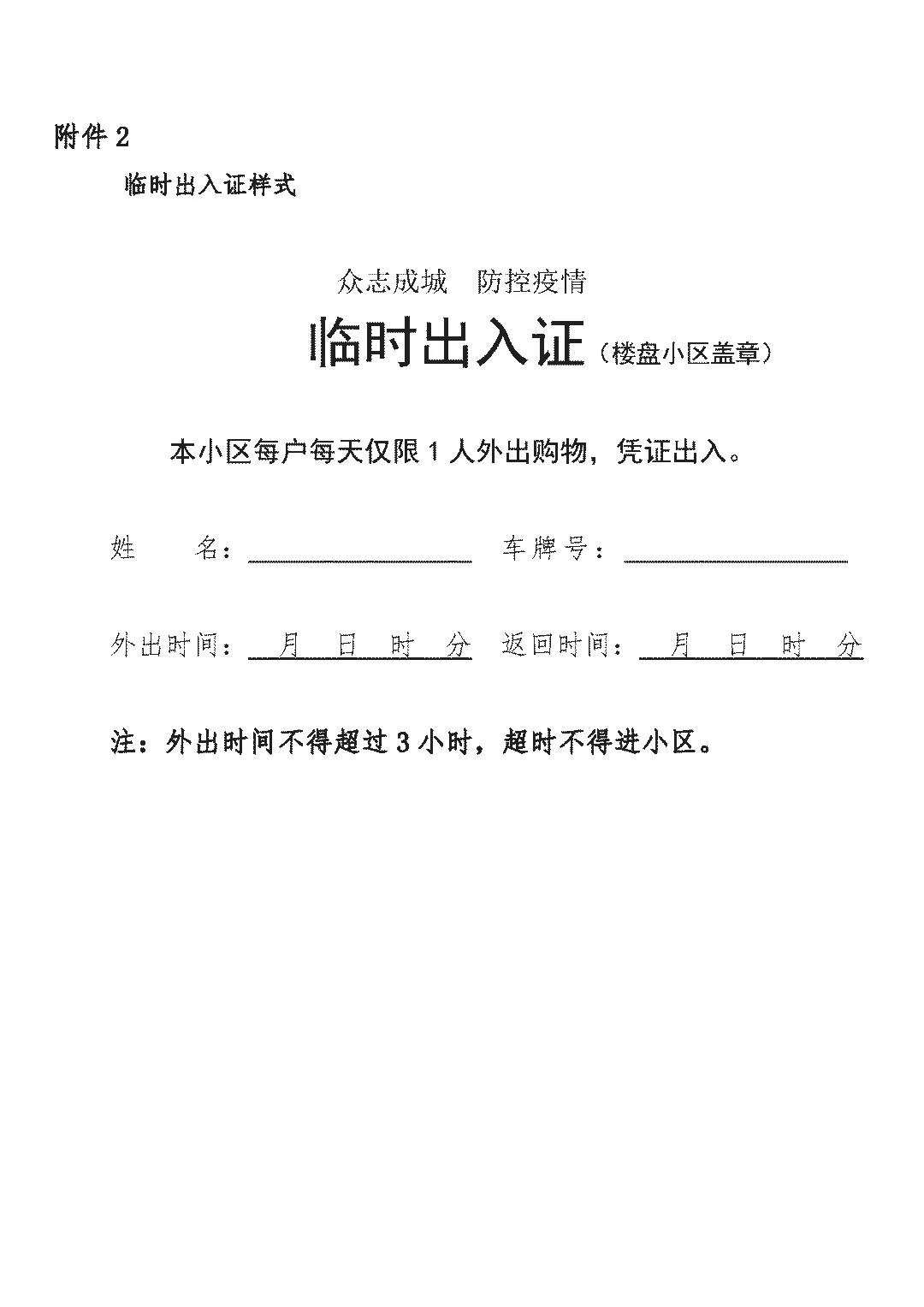 二、现将《临时出入证》样式、《告示牌》样式内容发给你们,请于2月8日前落实到位。各镇(街道)即转至各村(社区)并参照执行(详见附件1);各单位(详见附件2)要将单位宿舍管理到位,市住建局还须督促各大楼盘小区抓好落实。