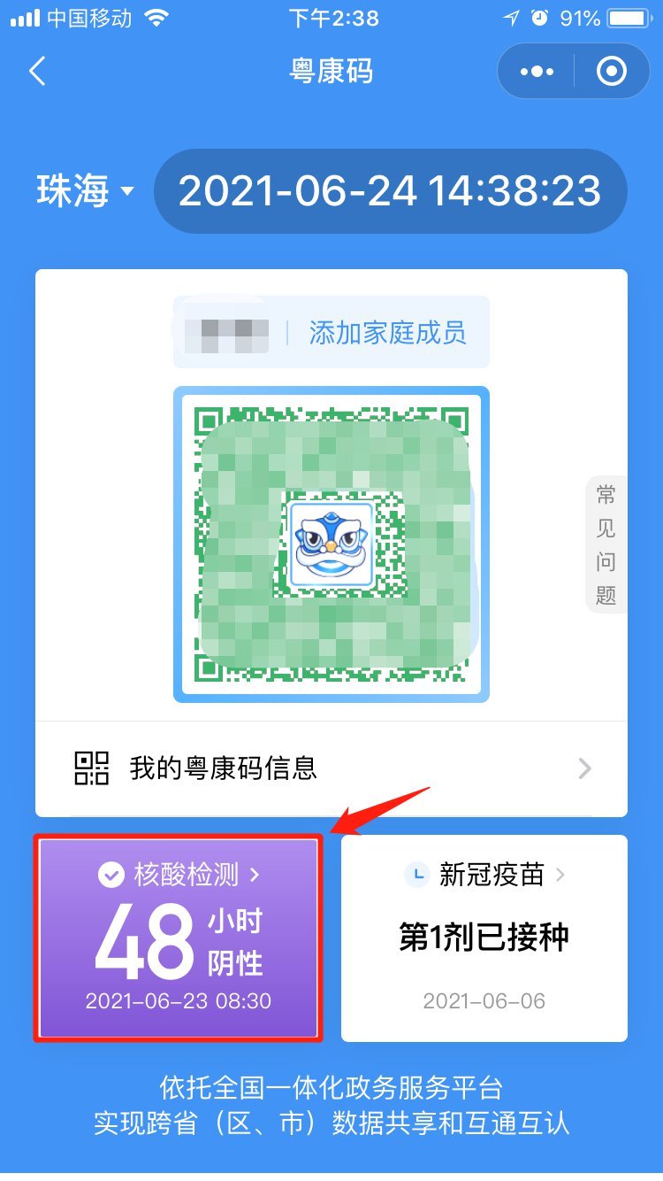 打开“粤省事”小程序,点击进入“粤康码”版块,在健康码左下方会显示个人核酸检测记录;