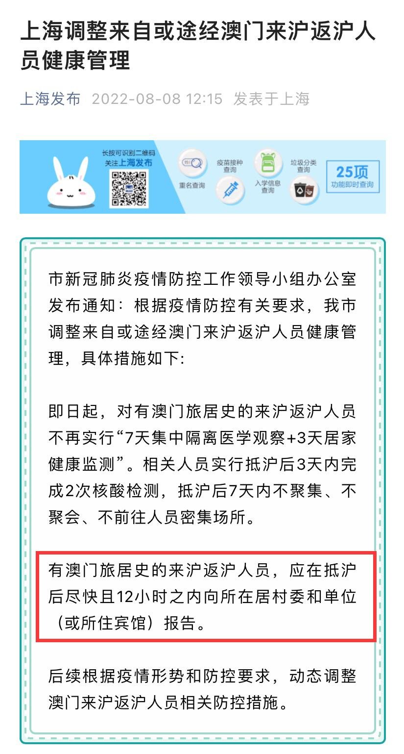自2022年8月8日起,有澳门旅居史的来沪返沪人员无需隔离。