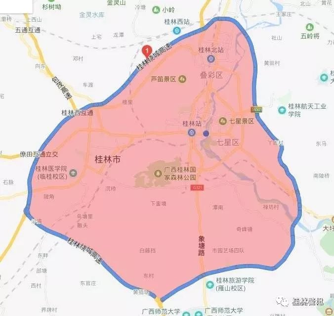 1、泉南高速粟家互通至庙岭互通、包茂高速庙岭互通至池头互通、包茂高速池头互通至马面互通、桂林绕城高速公路粟家互通至马面互通路段组成的环道以内的灵川县、临桂区、象山区、秀峰区、叠彩区、七星区 、雁山区相关区域;